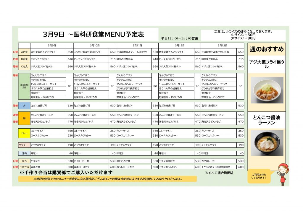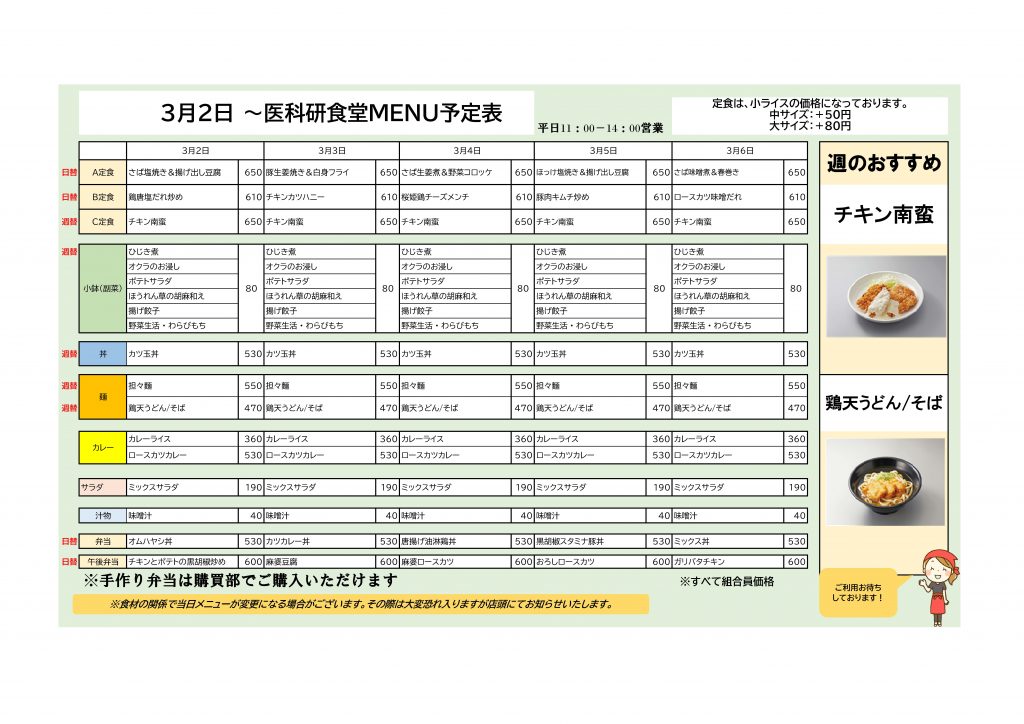 お知らせ 20262/26 医科研 医科研食堂3/2~3/13メニュー予定&購買部華一弁当予定表 いつも医科研食堂・購買をご利用いただきましてありがとうございます。 ●3月2日~医科研食堂おすすめ:【C定食】チキン南蛮定食 【麺】鶏天うどん/そば ●3月9日~医科研食堂おすすめ:【C定食】アジ大葉フライ梅タルタル定食 【麺】とんこつ醤油ラーメン また、ご好評の華一日替わり仕出し弁当も購買にてご用意しております。(平日毎日2種:土曜・日曜・祝日は店舗休業の為、提供はございません) ご利用のほどお待ちしております! Tweet お知らせ 一覧へ
