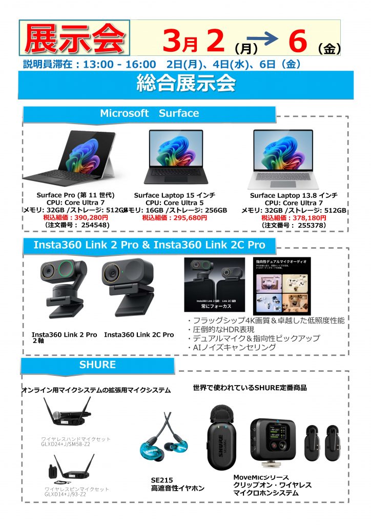 お知らせ 20262/26 本郷(浅野弥生) ノートPC・周辺機器総合展示会開催 3/2(月)~3/6日(金) ノートPC・周辺機器の総合展示会を開催します! 3/2(月)~3/6日(金) 説明員滞在︓13:00 – 16:00 2日(月)、4日(水)、6日(⾦) 校費でご利用におすすめの展示内容です・Microsoft Surface・Insta360 高品質WEBカメラ・SHURE 会議用ワイヤレスシステム、イヤホン、 ノベルティグッズもございますので、ぜひお気軽にお立ち寄りください! 皆様のご来場を心よりお待ちしております! ノートPC・周辺機器総合展示会開催 Tweet お知らせ 一覧へ