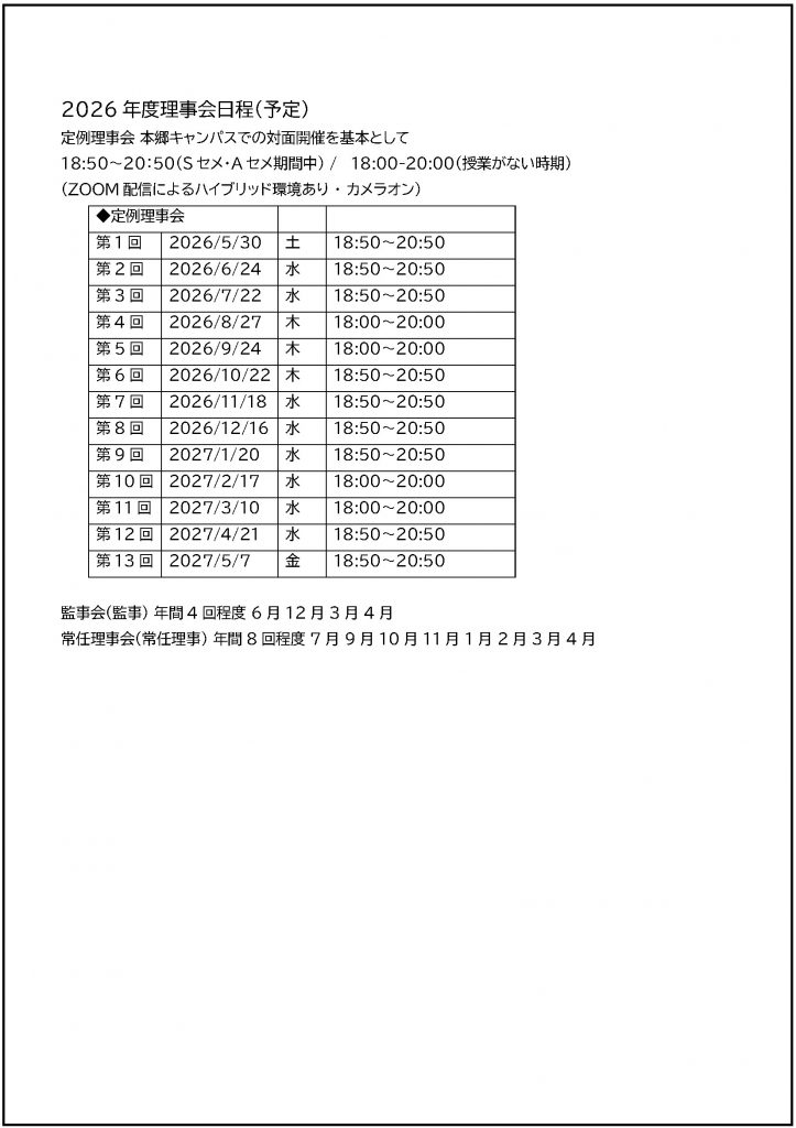 2026年度理事会日程(予定)※理事会への出席は役員の職務の一部です。