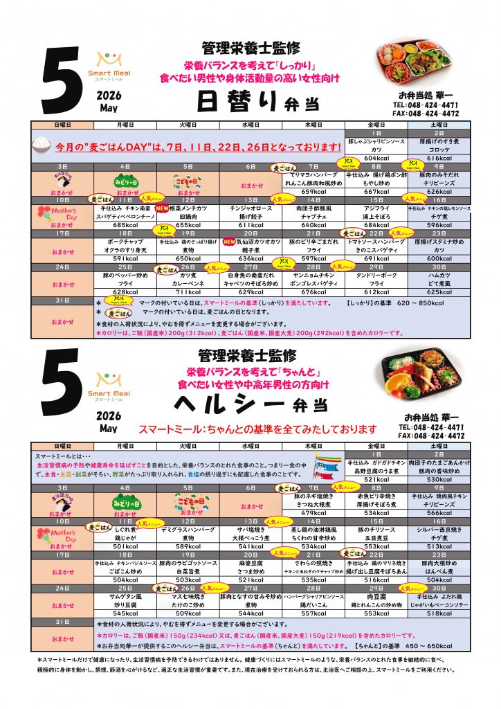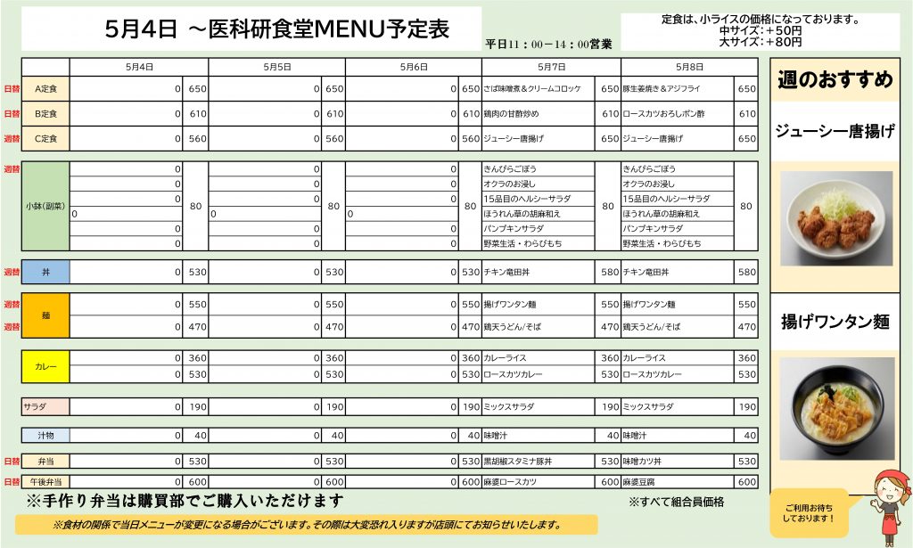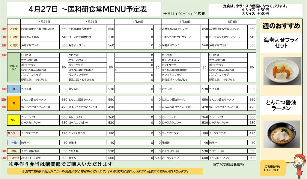 お知らせ 20264/23 医科研 医科研食堂4/27~5/8メニュー予定 いつも医科研食堂・購買をご利用いただきましてありがとうございます。 ●4月27日~医科研食堂おすすめ:【C定食】海老よせフライ定食 【麺】とんこつ醤油ラーメン ●5月7日~医科研食堂おすすめ:【C定食】ジューシー唐揚げ定食 【麺】揚げワンタン麺 また、ご好評の華一日替わり仕出し弁当も購買にてご用意しております。(平日毎日2種:土日・祝日は店舗休業の為提供はございません) ご利用の程お待ちしております。 Tweet お知らせ 一覧へ