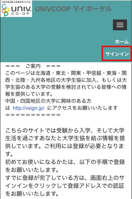 ①まずは『univcoopマイポータル』にアクセスし、メニューバー(スマホの方は右上の三本線)より「サインイン」をタップします。
