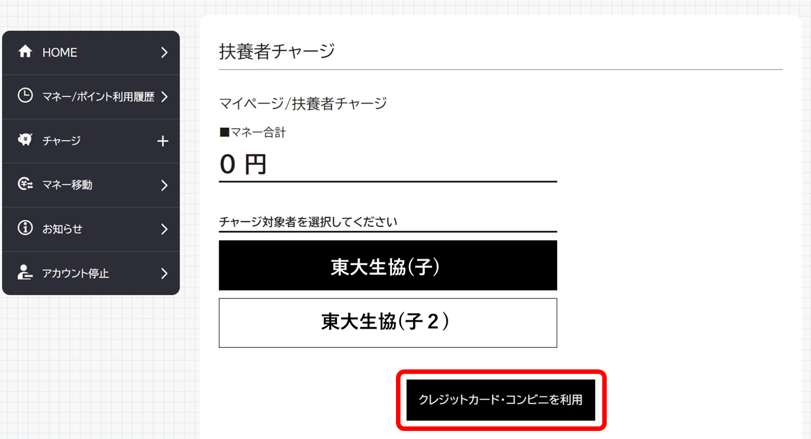 ②「チャージ対象者」を選択すると、画面下にお子様のマネー残高が表示されます。