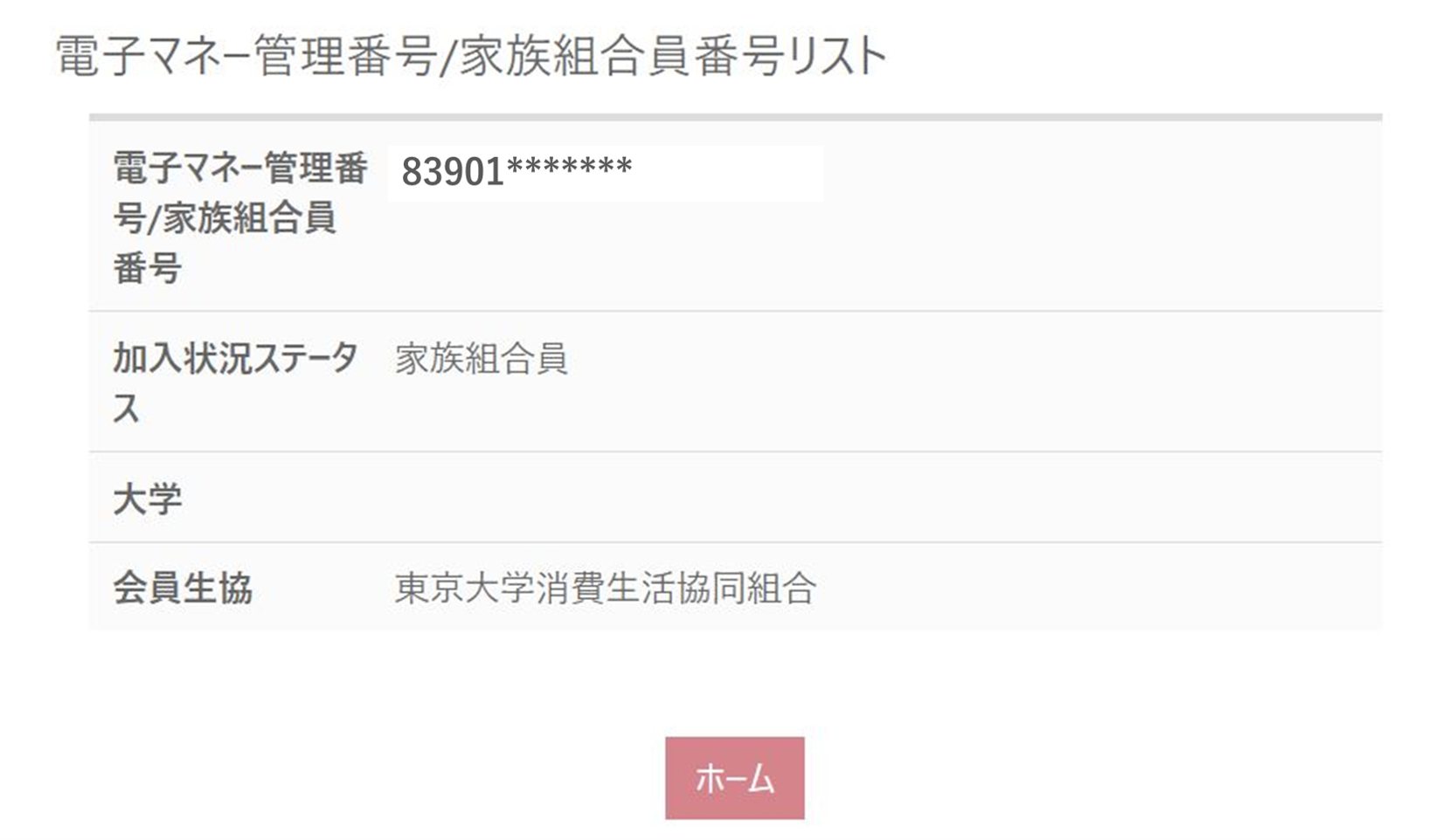 univcoopマイポータルの「プロファイル」の最下部に「家族組合員番号」が表示されているかを確認してください。