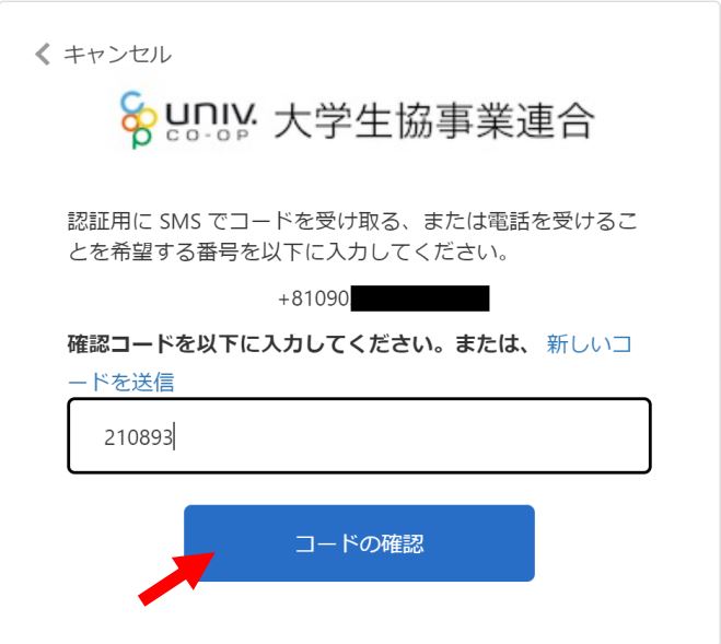 ④届いたコードを入力し「コードの確認」をタップします。