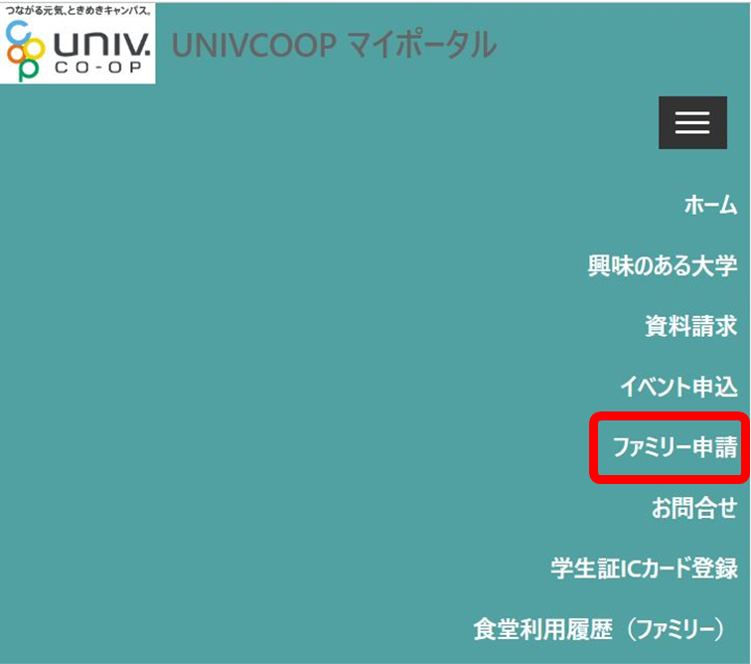 ①メニューバー(スマホの方は三本線)より「ファミリー申請」をタップします。