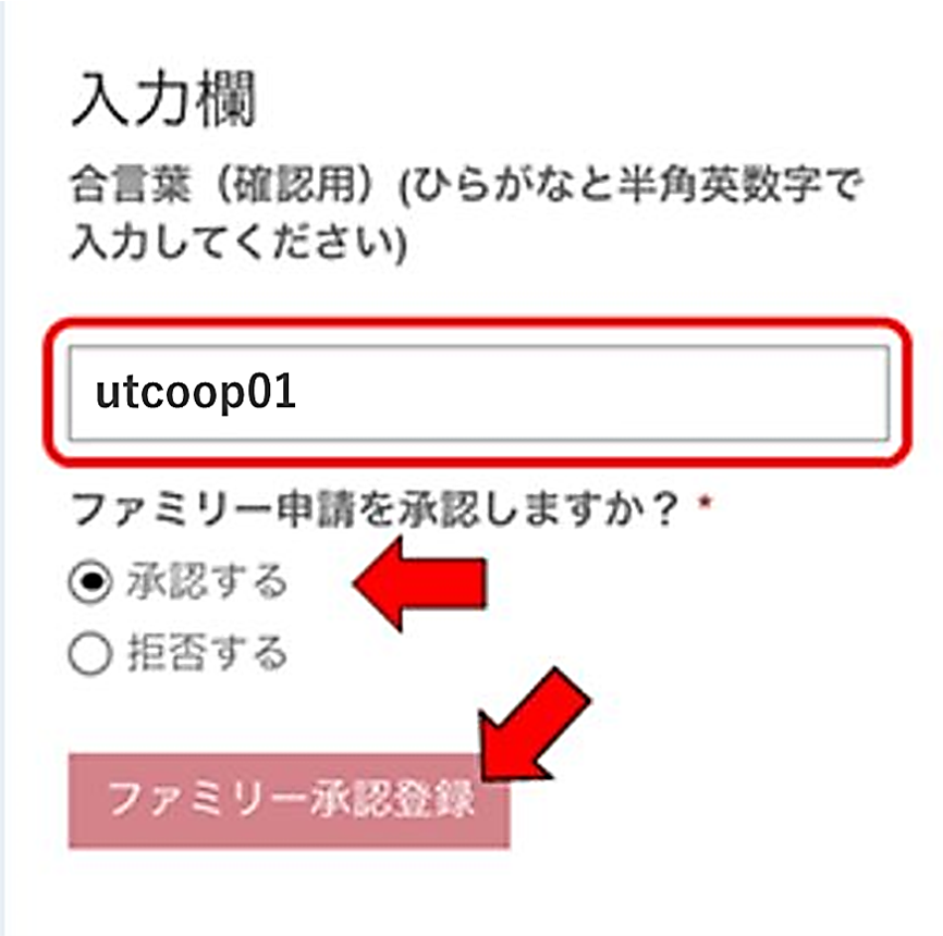 ④ファミリー承認画面に移ります。「合言葉」を入力し、「承認する」を選択。「ファミリー承認登録」をタップします。