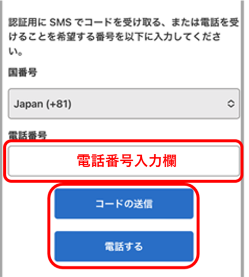 ⑥認証の画面に移ります。「電話番号」を入力し「コードの送信」または「電話する」のどちらかを選択します。