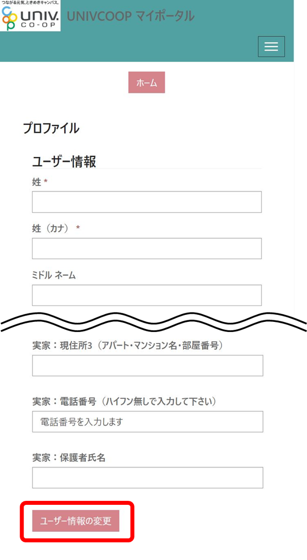 ⑧プロファイル画面に移ります。保護者情報を入力ください。入力後に、最下部にある「ユーザー情報の変更」をタップします。