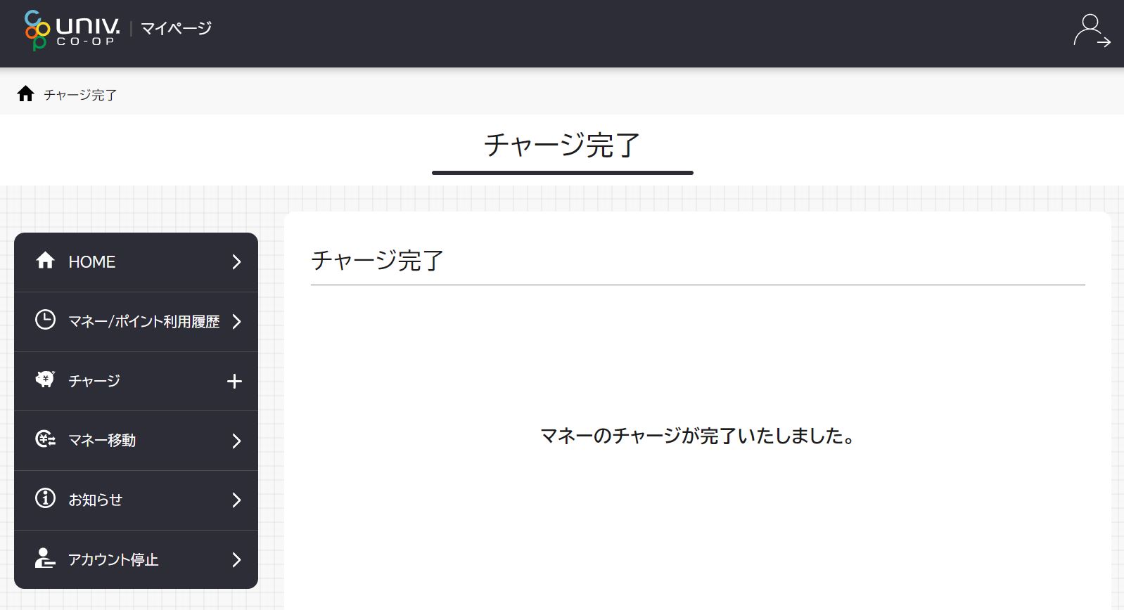 A. 現在、保護者の組合員マイページからは、お子様へのチャージ履歴や残高が確認できません。確認いただけるよう、事業連合でシステム改修中です。大変申し訳ございませんが、チャージの反映や残額はお子様とご確認ください。