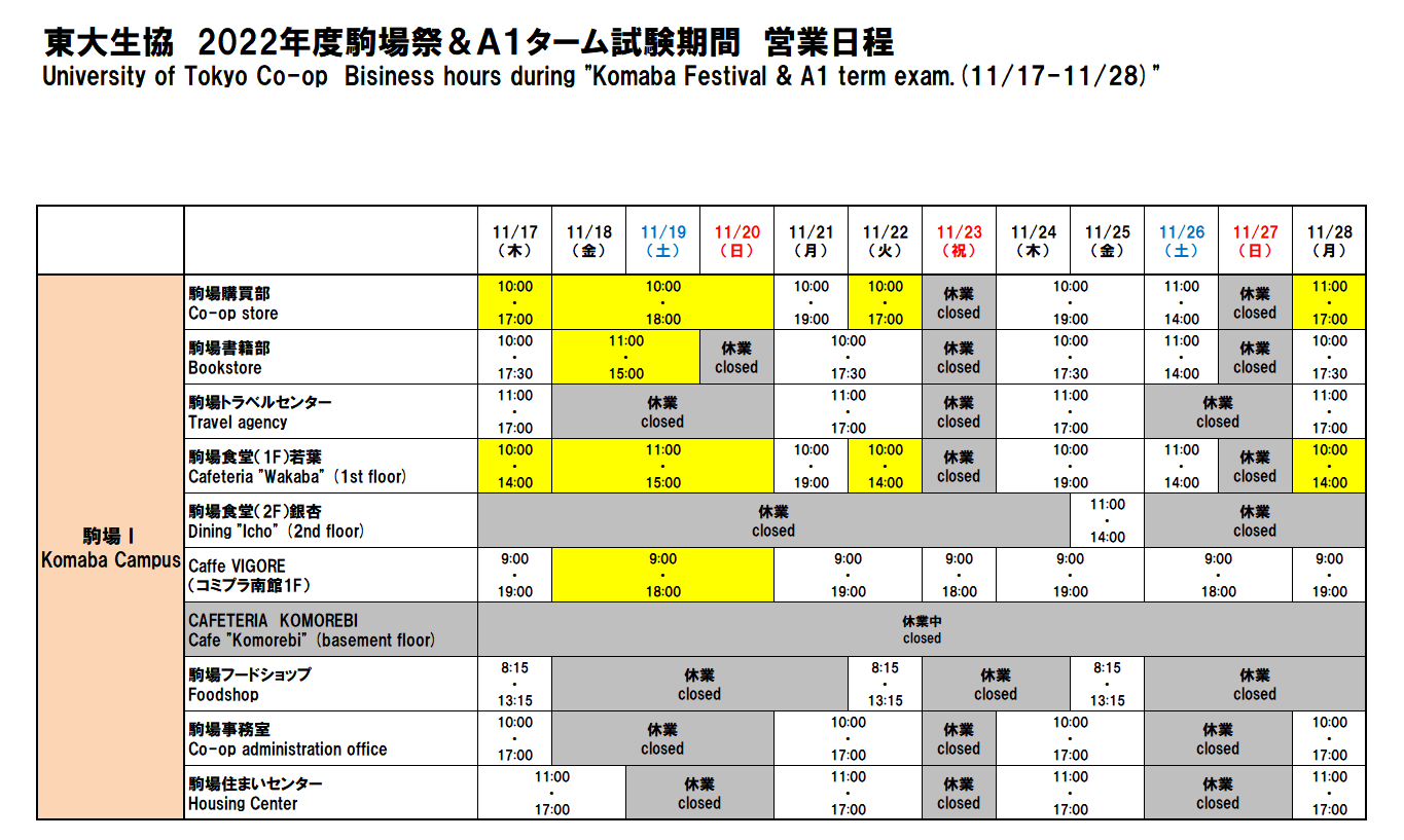 駒場祭、およびA1ターム試験に伴い、11月17日(木)~28日(月)の駒場Ⅰキャンパス各店舗の営業日程は下記の通りとなります。その他の店舗(本郷キャンパス・附置研)は暦通りの営業です。