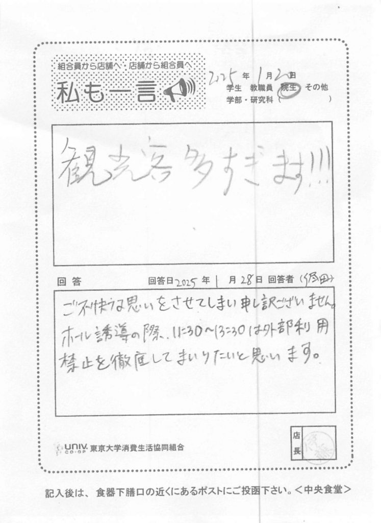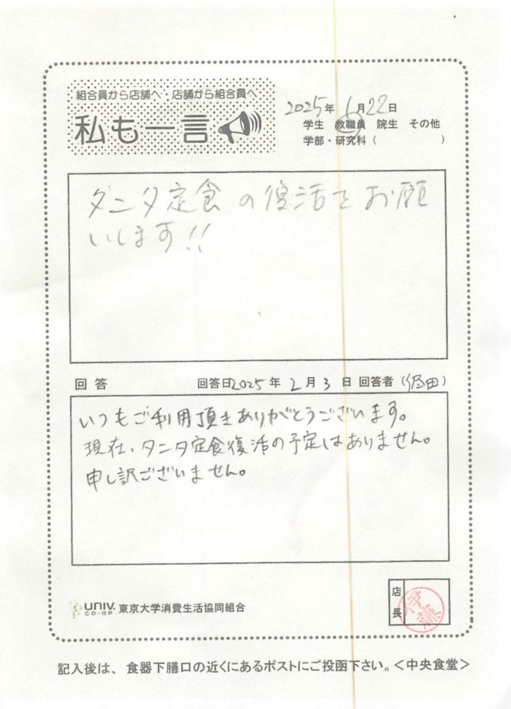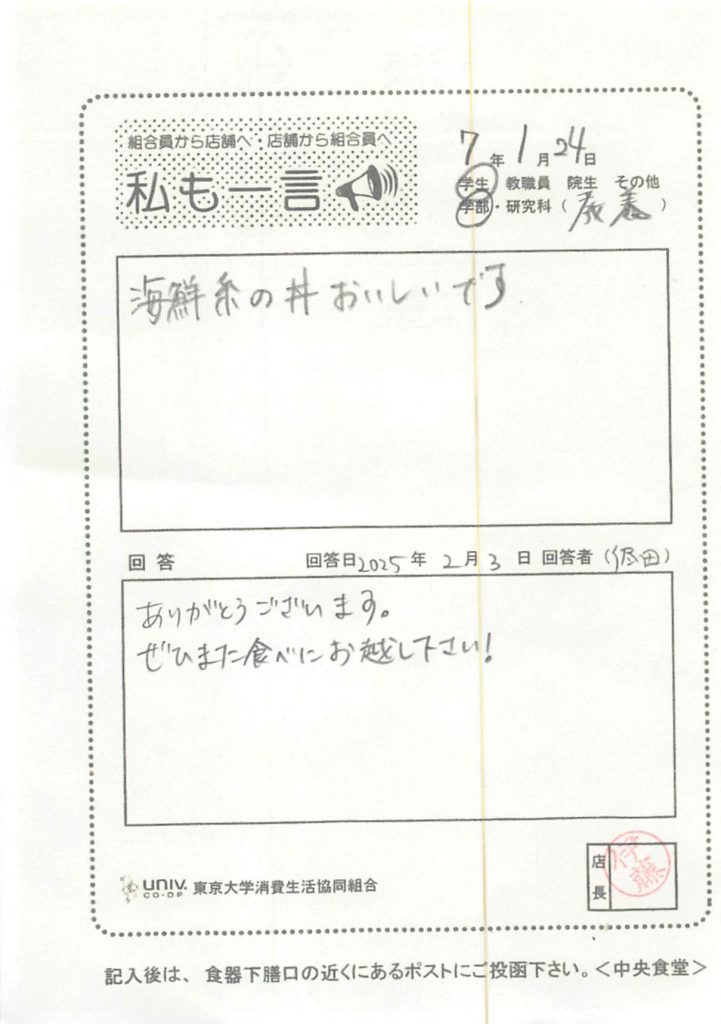 网上发帖本乡食堂 20252/25 一个切碎的米碗和takana黄瓜泡菜... 问: 我想要一些米碗中的takana黄瓜泡菜! A: 这是一个两种彩色的碗,但它将是合作社餐厅的联合菜单。卡路里和过敏原也有所不同,因此不能仅在东京大学添加泡菜。感谢您的理解。您的评论将用作未来菜单创建的参考。 鸣叫