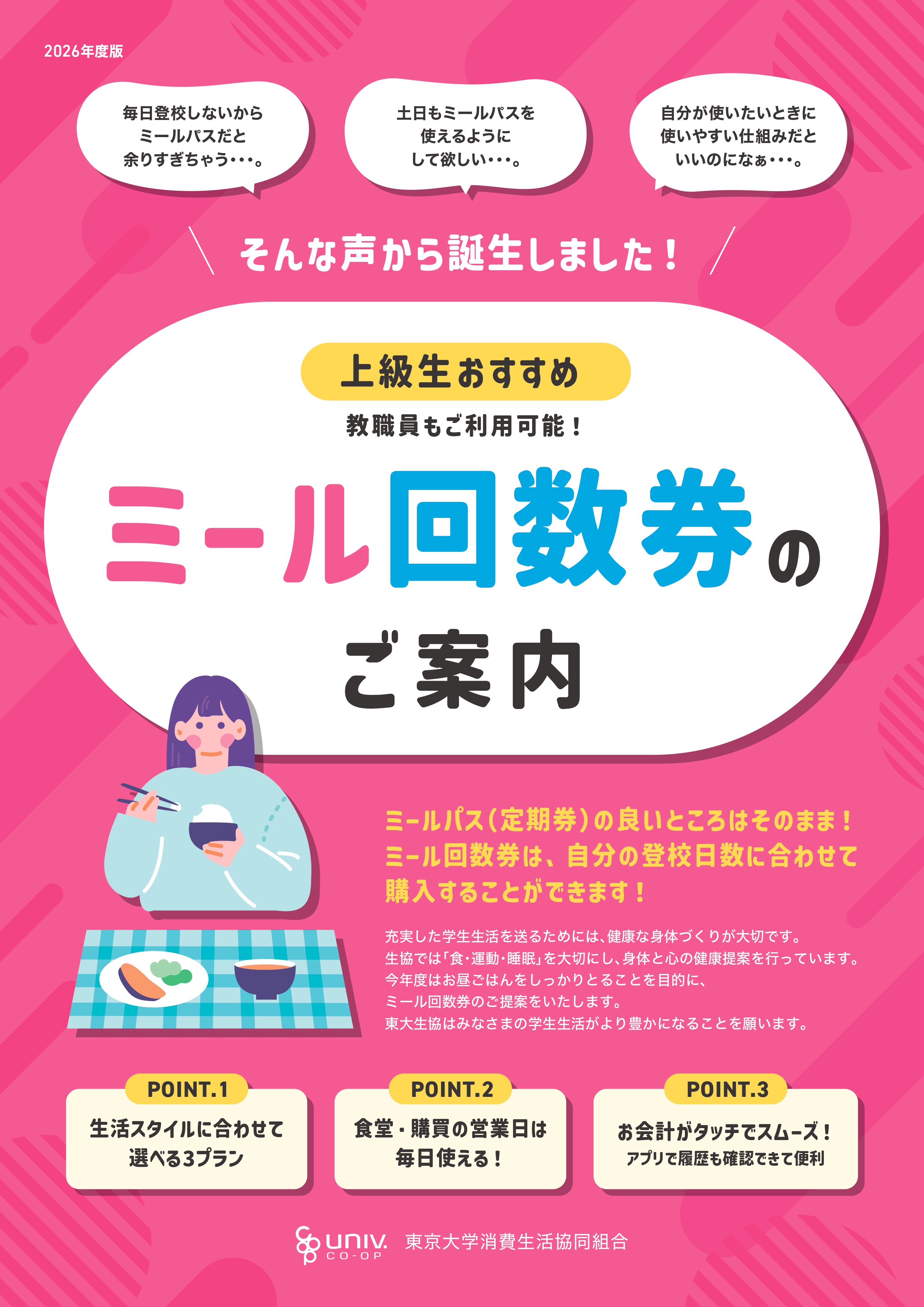 基本规则是积分必须用完,但为了安心那些因学业或出勤等原因“无法用完”积分的人,剩余的积分(餐券余额)可用于购买下一年的餐食(*需申请续订至2027年)。如果余额达到或超过2200日元,则需支付2200日元的手续费。