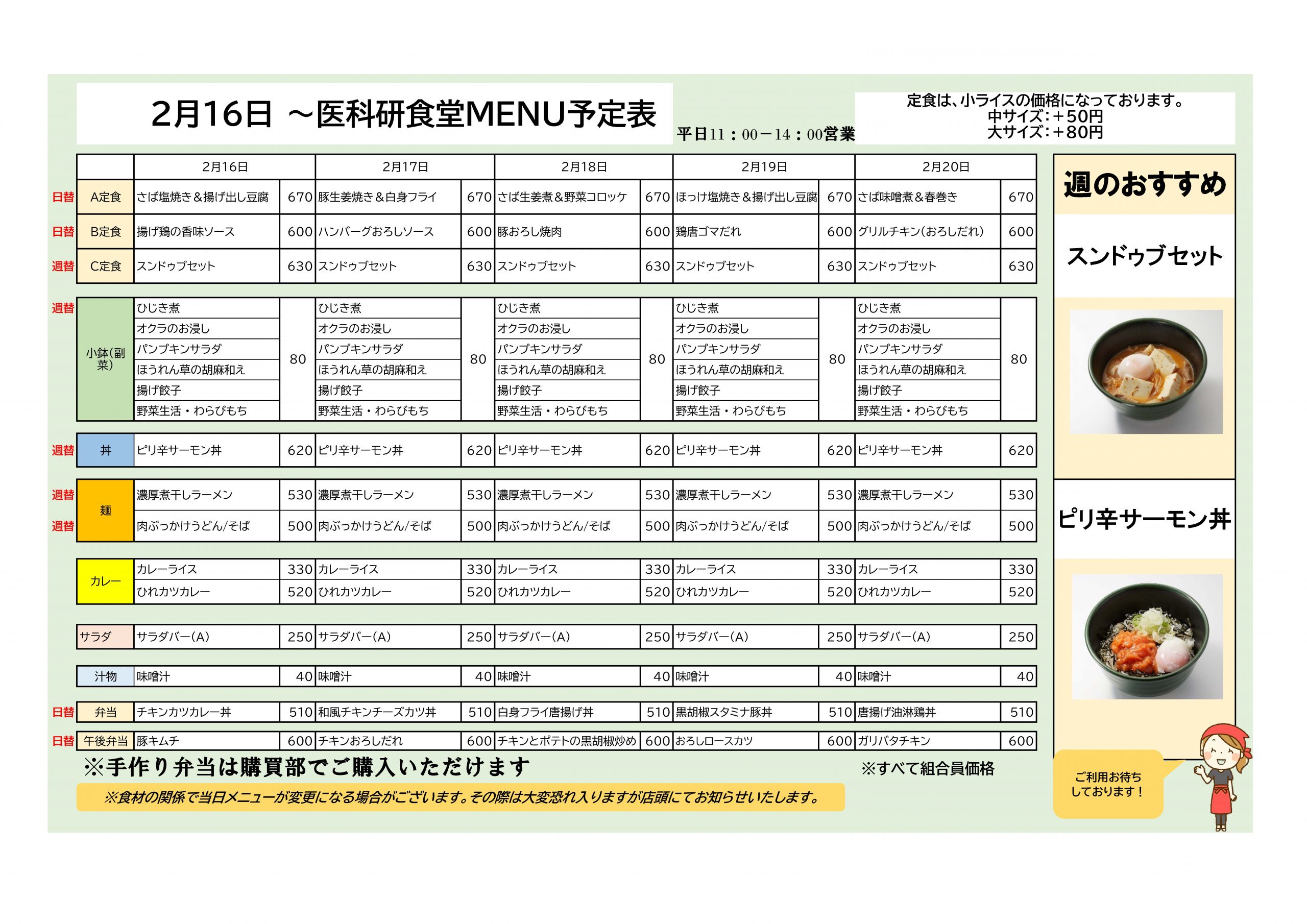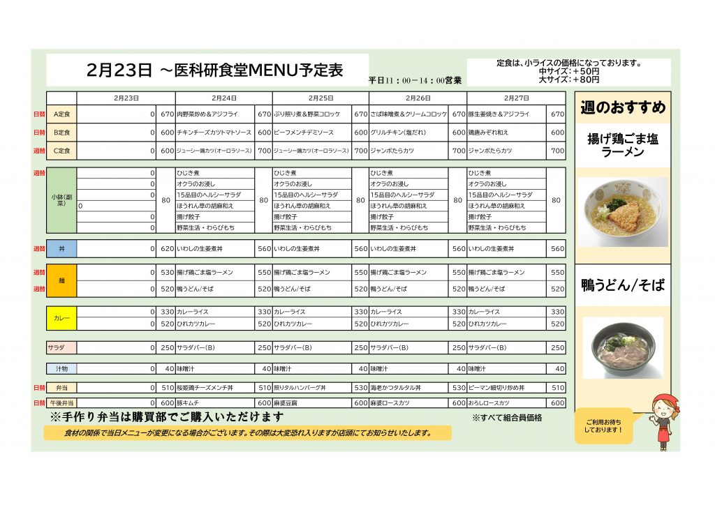 注意 20262/12 医学科学研究所食堂 2月16日至2月27日菜单安排及采购部 花一午餐安排 感谢您一直以来光顾医学科学研究所餐厅和采购中心。 ●2月16日 - 医学科学研究所食堂推荐【套餐C】:嫩豆腐套餐【盖饭】辣味三文鱼盖饭 ●2月23日起,医学科学研究所食堂推荐:【面条】炸鸡芝麻盐拉面【面条】鸭肉乌冬面/荞麦面 本店还提供广受欢迎的 Hana 每日外卖午餐盒服务(工作日每天提供两种类型;周六、周日及公众假期不提供,因为本店休息)。 期待您的使用! 鸣叫 新闻列表