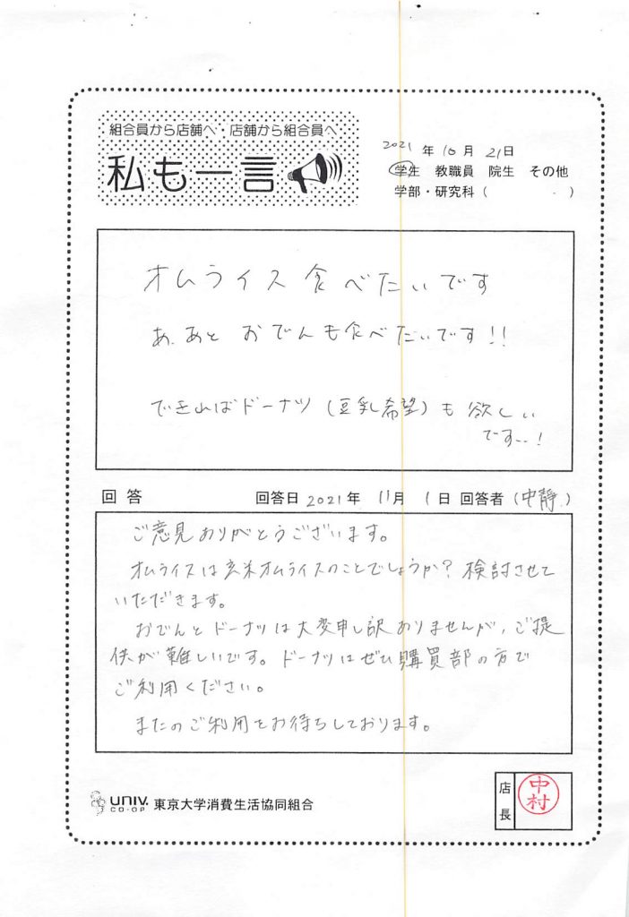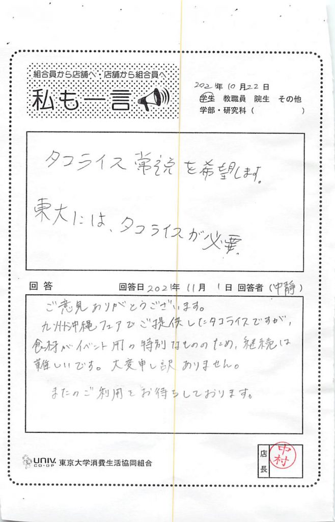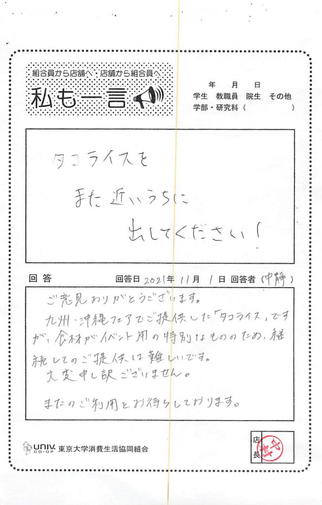 感谢您的反馈意见。 驹场食堂目前正在通过公告请求大家配合安静饮食。 虽然我们一直在采取预防措施来呼唤顾客,但我们会加强巡逻和呼唤顾客,以便每个人都可以放心使用我们的设施。