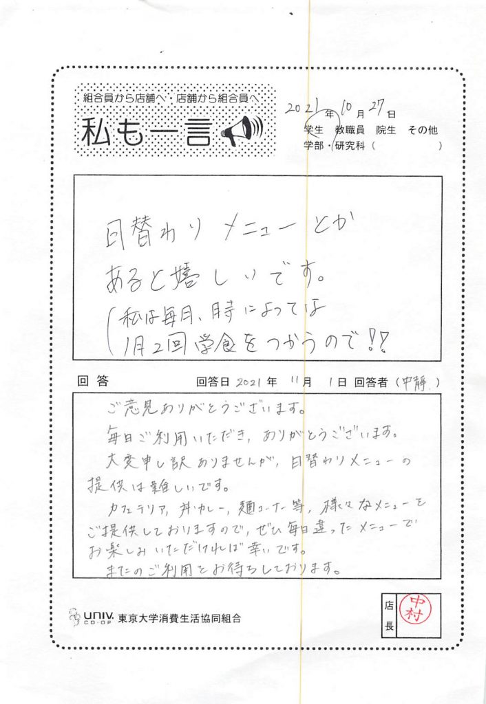 目前看来,人们都在要求人们安静地吃饭,但在驹场食堂内部却根本没有遵守这一点。 请注意食堂内大声喧哗的人。 如果你压低声音,偶尔交谈一下,也许还可以忍受,但如果你发出很大的声音,让人感觉吵闹,我想你为防止感染所做的努力就会付诸东流。 希望大家对这样的人提高警惕,提高警惕。